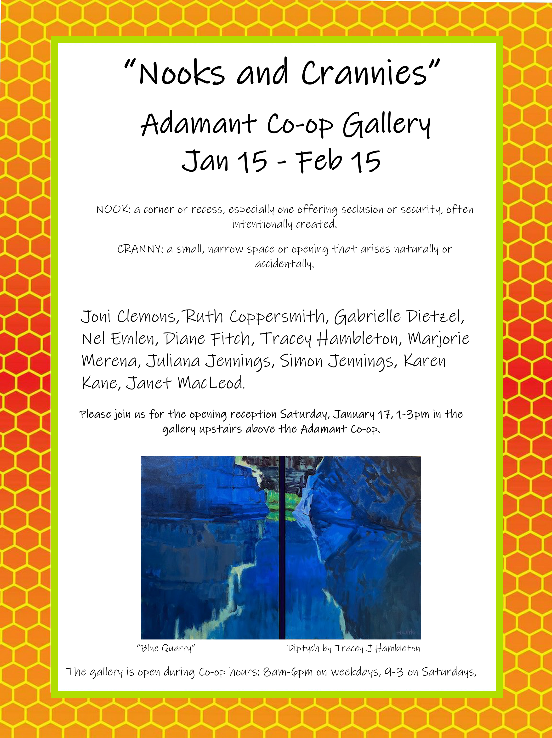 Please join us for the opening reception Saturday, January 17, 1-3pm in the gallery upstairs above the Adamant Co-op